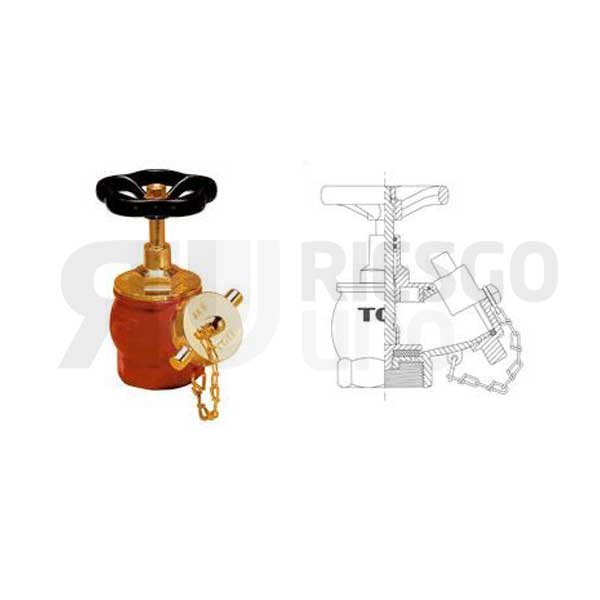 • Válvula tipo teatro para hidrantes de seguridad contra incendio. Cuerpo de bronce fundido de alta resistencia con terminación de esmalte sintético rojo y volante ergonométrico de aleación de aluminio, inyectado con protección epoxy color negro. Conexión de salida a 45° para manguera de incendio, roscada o storz y conexión de entrada inferior hembra con rosca BSP.